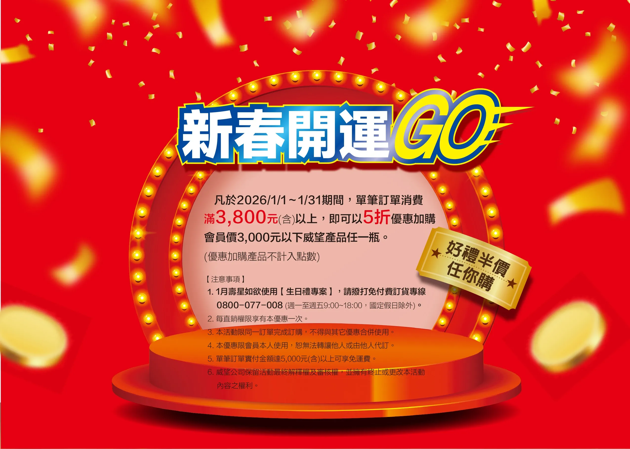 凡於2026/1/1~1/31期間,單筆訂單消費滿3,800元(含)以上,